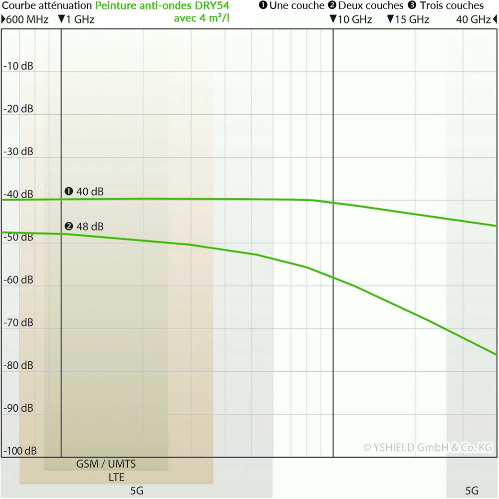 Les peintures de blindage Yshield permettent une atténuation des ondes presque linéaire pour une très large gamme de fréquences comprenant à la fois les spectres de fréquence 5G FR1 (600 MHz – 6 GHz) et FR2 (24 GHz – 40 GHz).
